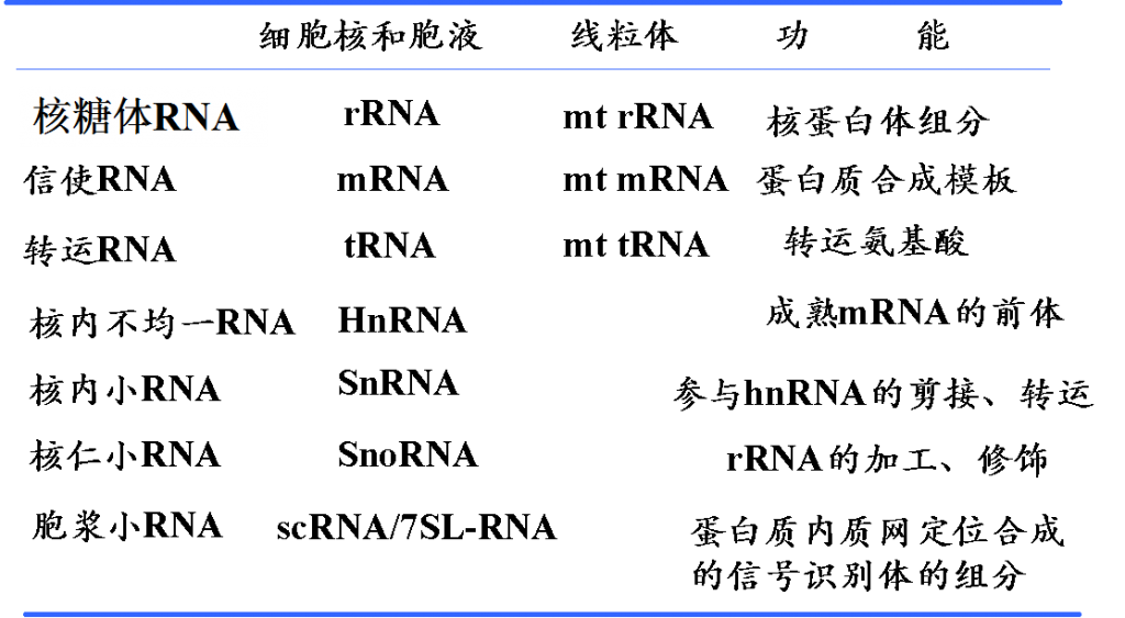 RNA的種類、分布、功能