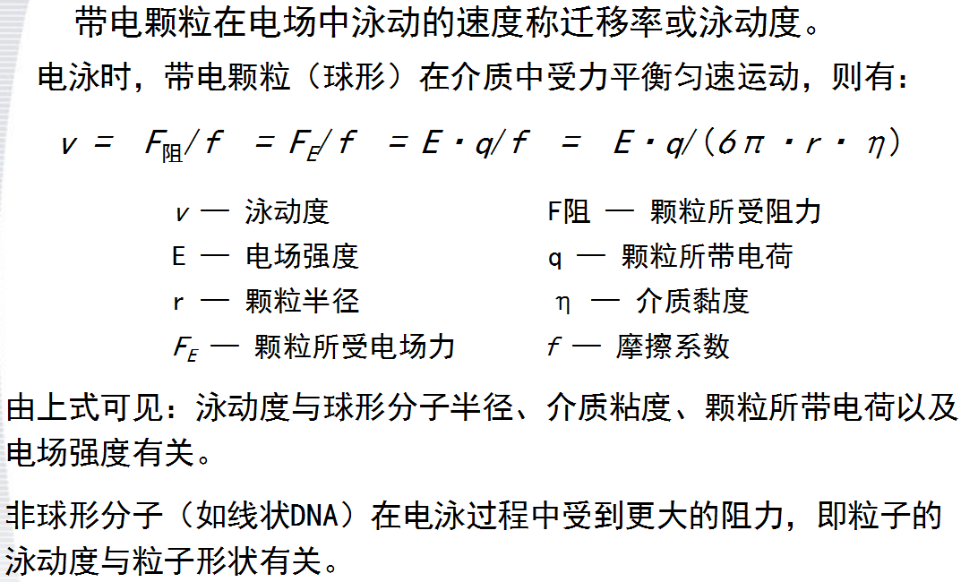 電泳是帶電顆粒在電場(chǎng)作用下,向著與其電荷相反的電極移動(dòng)的現(xiàn)象。 在一定pH條件下,每一種分子都具有特定的電荷(種類和數(shù)量)、大小和形狀,在一定時(shí)間內(nèi)它們?cè)谙嗤妶?chǎng)中泳動(dòng)速度不同,各自集中到特定的位置上而形成緊密的泳動(dòng)帶。這就是帶電粒子可以用電泳技術(shù)進(jìn)行分離、分析和鑒定的基本原理。